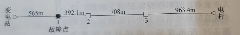 此線路在運行中發生接地故障,用兆歐表測試三相對地都為0,改用萬用表測試,得各相絕緣電阻為:A相對地 50 kΩ、B相對地 20kΩ、C 相對地 10kΩ,診斷此電纜發生了多相高阻接地古障。電纜敷設情況如圖 9-1所示。
