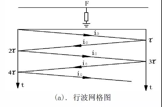 如圖9.a行波網格圖所示,球間隙擊穿后,高電壓波-E沿電纜向前運動,相應的電流波為i0=-E/Z0,經時間τ后,高電壓波到達故障點,故障點開始電離,在經放電延時td后,擊穿放電。電壓從-E突跳到0,產生如直閃法擊穿類似的行波過程,相應的電流波形與電流取樣耦合器的輸出分別見圖9.b與9.c 。